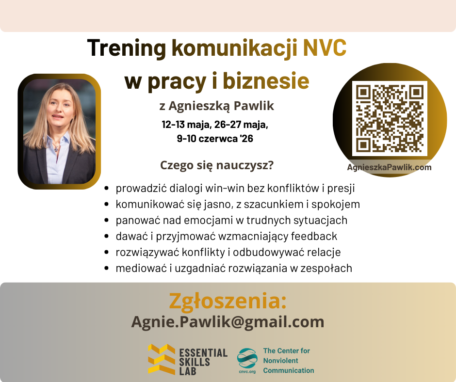 Nonviolent Communication (NVC) to metoda precyzyjnej i empatycznej komunikacji. Pomaga ograniczyć liczbę nieporozumień i konfliktów, zyskując więcej spokoju, zaufania, jakości relacji i czasu. Kurs dostarcza praktycznych narzędzi, które wspierają zarówno relacje zawodowe, jak i życie rodzinne, prywatne oraz społeczne.