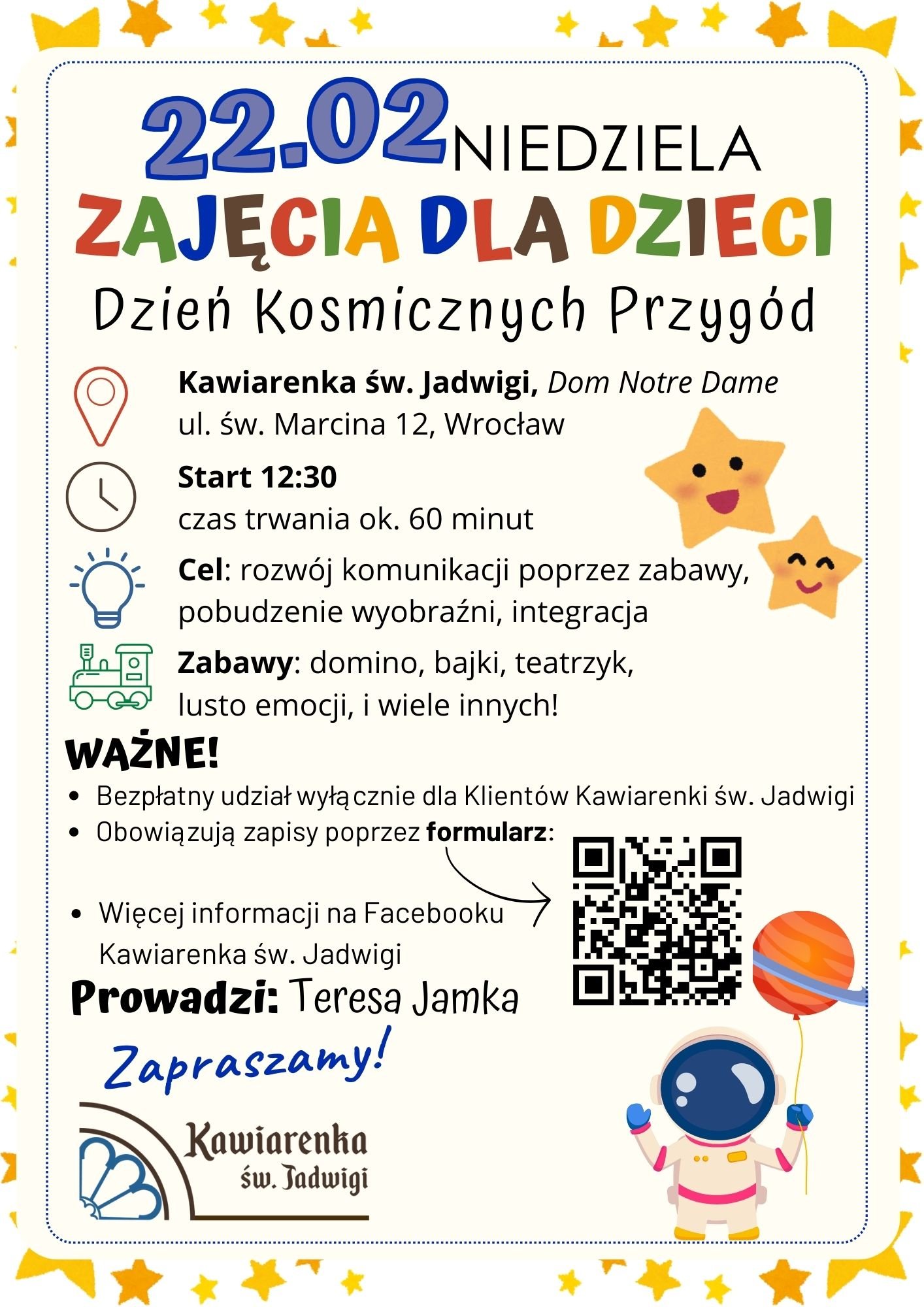 Zapraszamy na prawdziwie kosmiczne zajęcia dla dzieci w Kawiarence św. Jadwigi! To idealny czas dla całych rodzin – godzina edukacyjnych gier i zabaw w miłej, rodzinnej atmosferze.