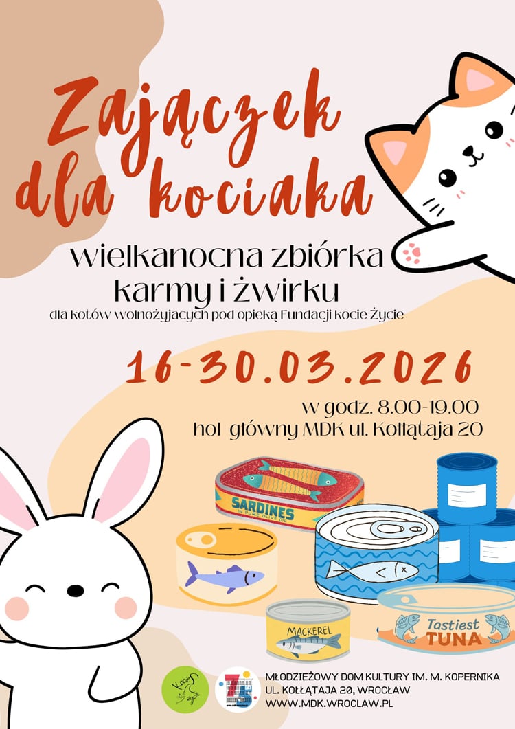 Karmę i żwirek można przynosić od 16 do 30 marca 2026 roku, w godzinach 8:00–19:00, do holu Młodzieżowego Domu Kultury im. Mikołaja Kopernika, ul. Kołłątaja 20.