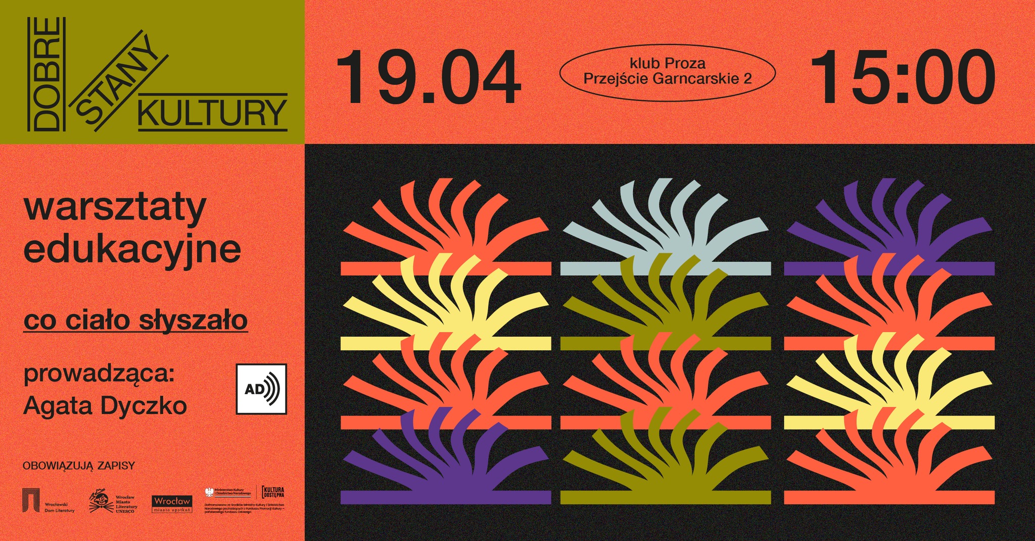 Warsztaty zostaną poprzedzone audiodeskrypcją. Osoby ze szczególnymi potrzebami mogą skorzystać z pętli indukcyjnych i asystencji osobistej, po wcześniejszym zgłoszeniu na ten sam adres e-mail.