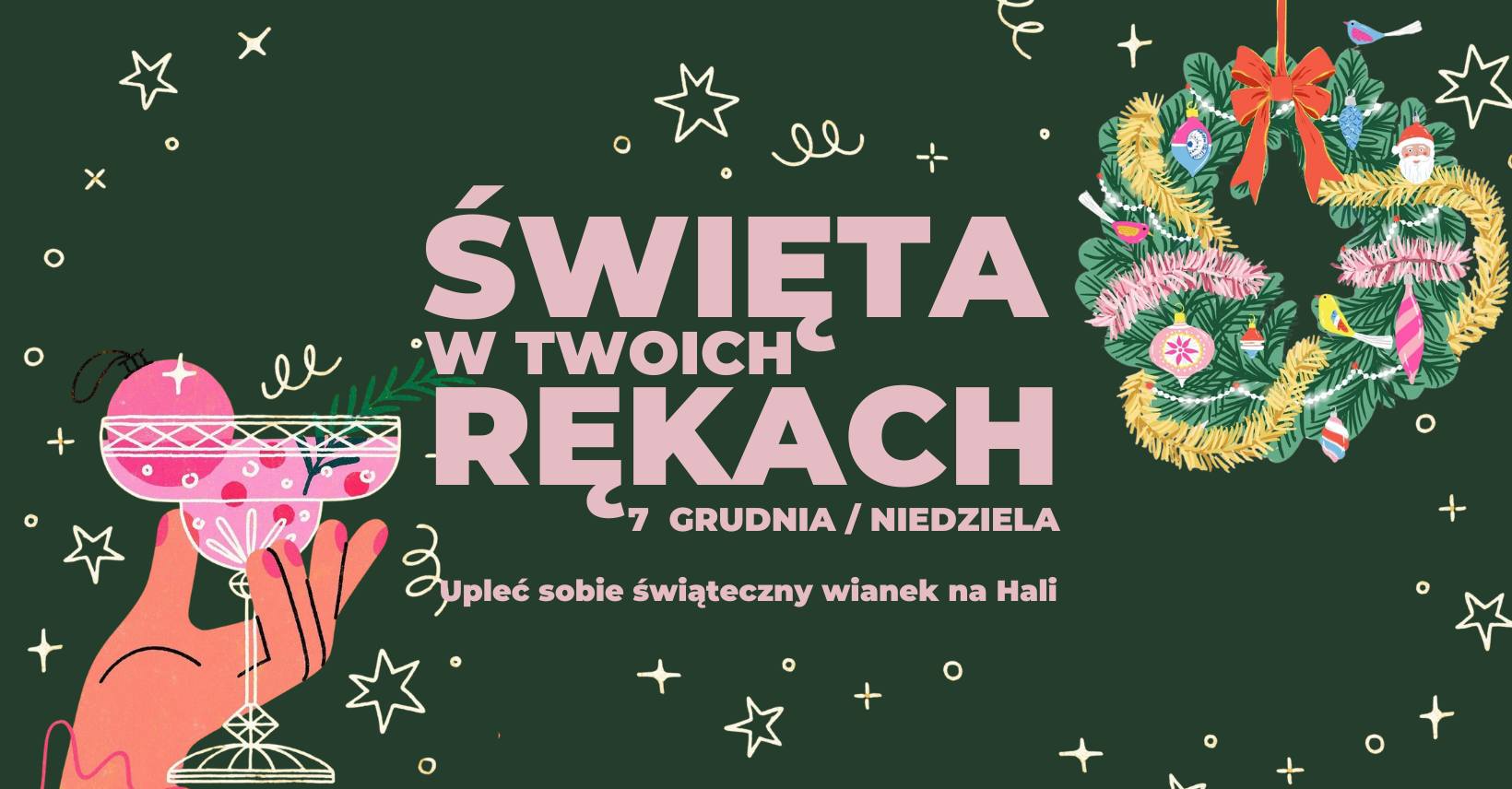 Zapraszamy na warsztaty „Święta w Twoich rękach” w Hali Świebodzki, podczas których każdy uczestnik będzie mógł własnoręcznie upleść świąteczny wianek. To idealna okazja, aby połączyć kreatywność z magią nadchodzących świąt.