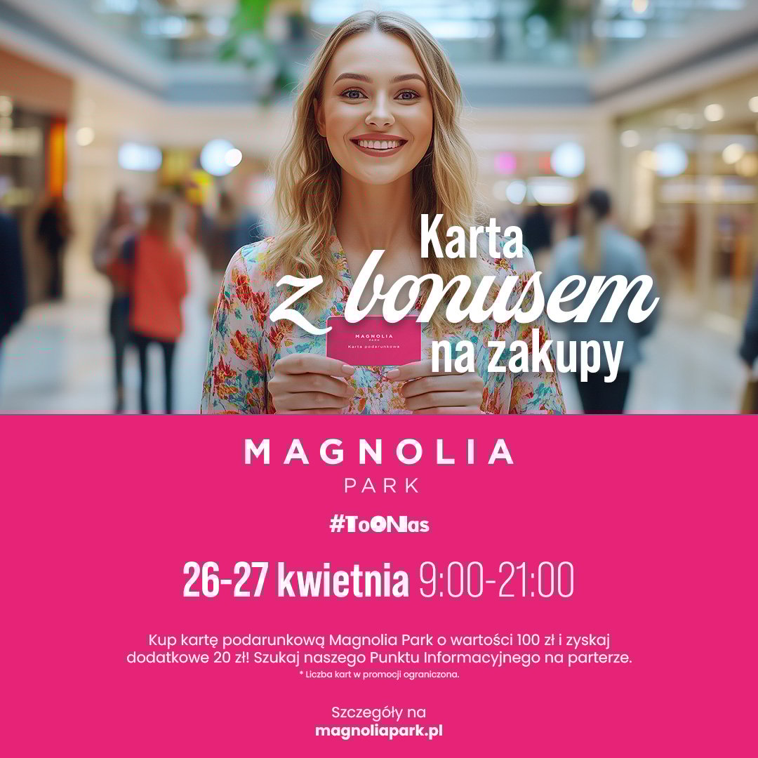W najbliższy weekend z niedzielą handlową, 26-27 kwietnia centrum handlowe Magnolia Park ponownie nagradza klientów dodatkowymi środkami na karcie podarunkowej w ramach akcji „Karta z bonusem”. To wyjątkowa okazja, by przy zakupie karty podarunkowej na kwotę 100 złotych, otrzymać dodatkowe 20 złotych doładowania.