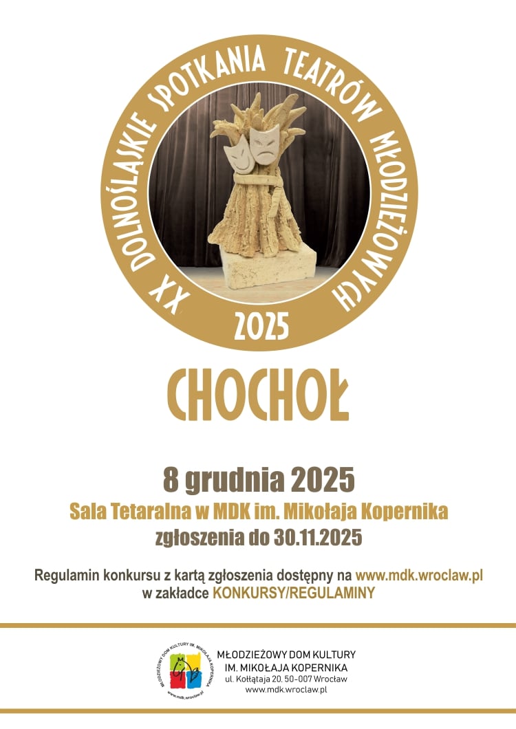 Młodzieżowy Dom Kultury im. Mikołaja Kopernika zaprasza do udziału w XX Dolnośląskich Spotkaniach Teatrów Młodzieżowych Cochoł. „Chochoł” ponownie zagości na deskach sceny MDK-u przy ul. Kołłątaja!