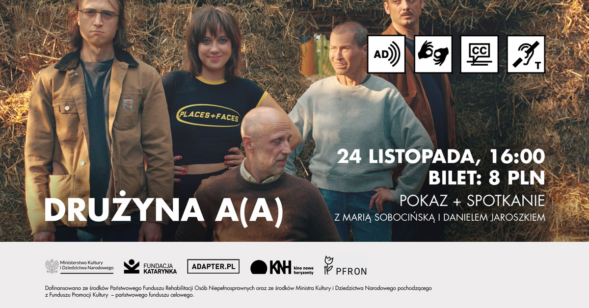 Fundacja Katarynka zaprasza na pokaz filmu „Drużyna AA” w reżyserii Daniela Jaroszka z audiodeskrypcją, napisami oraz tłumaczeniem na Polski Język Migowy (PJM) w Kinie Nowe Horyzonty. Przed pokazem odbędzie się rozmowa z Marią Sobocińską – aktorką występującą w filmie oraz reżyserem Danielem Jaroszkiem, który jest wieloletnim przyjacielem naszej fundacji. Daniel był gościem na jednym z naszych wcześniejszych pokazów swojego filmu „Johnny”.