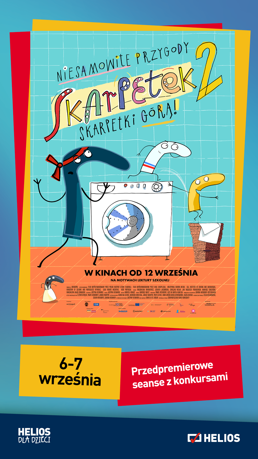 Kina Helios Wrocław Magnolia Park i Helios Wrocław Aleja Bielany zapraszają w dniach 6-7 września 2025 o godzinie 10:00 i 11:30 na przedpremierowe seanse filmu „Niesamowite przygody skarpetek 2. Skarpetki górą!”.