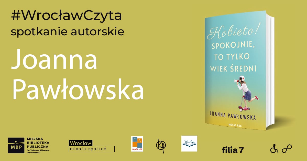 W ramach cyklu #WrocławCzyta i pierwszej kwietniowej literackiej środy filia nr 7 MBP im. Tadeusza Różewicza wraz ze stowarzyszeniem Kolektyw Pomysłów zapraszają 9 kwietnia o godz. 19:00 do Centrum Aktywności Lokalnej na Maślicach przy ul. Suwalskiej 11 na spotkanie autorskie z Joanną Pawłowską.