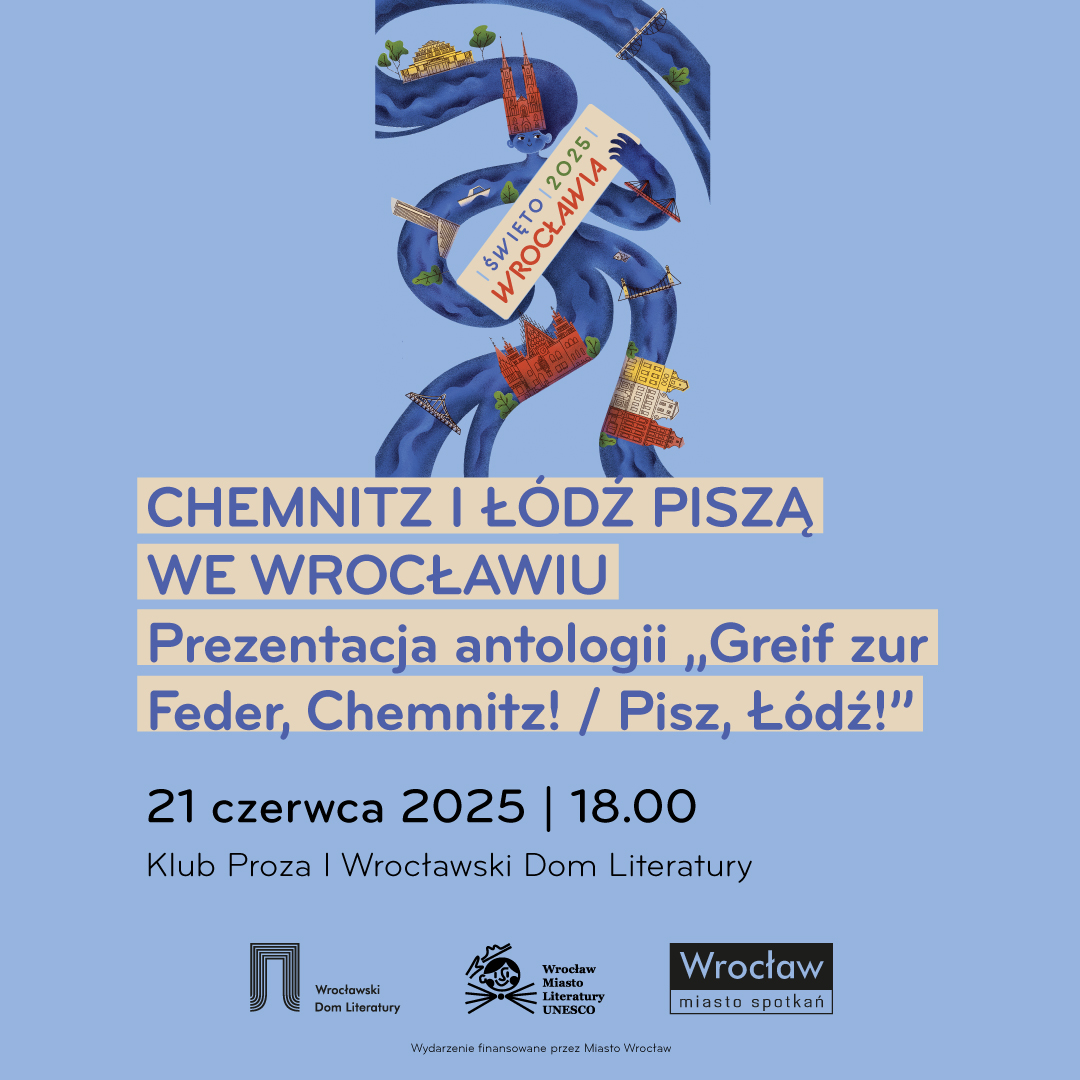 Zapraszamy na prezentację dwujęzycznej antologii „Greif zur Feder, Chemnitz! / Pisz, Łódź!”, będącej efektem warsztatów literackich odbywających się ramach programu 2025 Chemitz – Europejska Stolica Kultury. W wydarzeniu wezmą udział osoby zaangażowane w projekt po stronie niemieckiej (Chemnitz) i polskiej (Lódź).