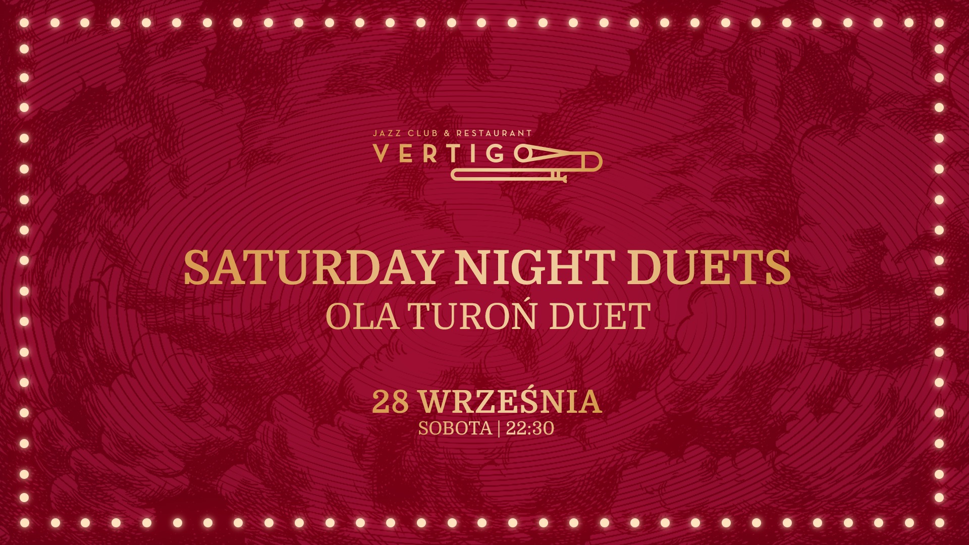 Zapraszamy na energetyczną odsłonę późnego sobotniego wieczoru. Podczas Saturday Night Duets wystąpi Ola Turoń. Wstęp jest wolny. Start: 22:30 Wieczorami lokal przeznaczony jest dla osób pełnoletnich