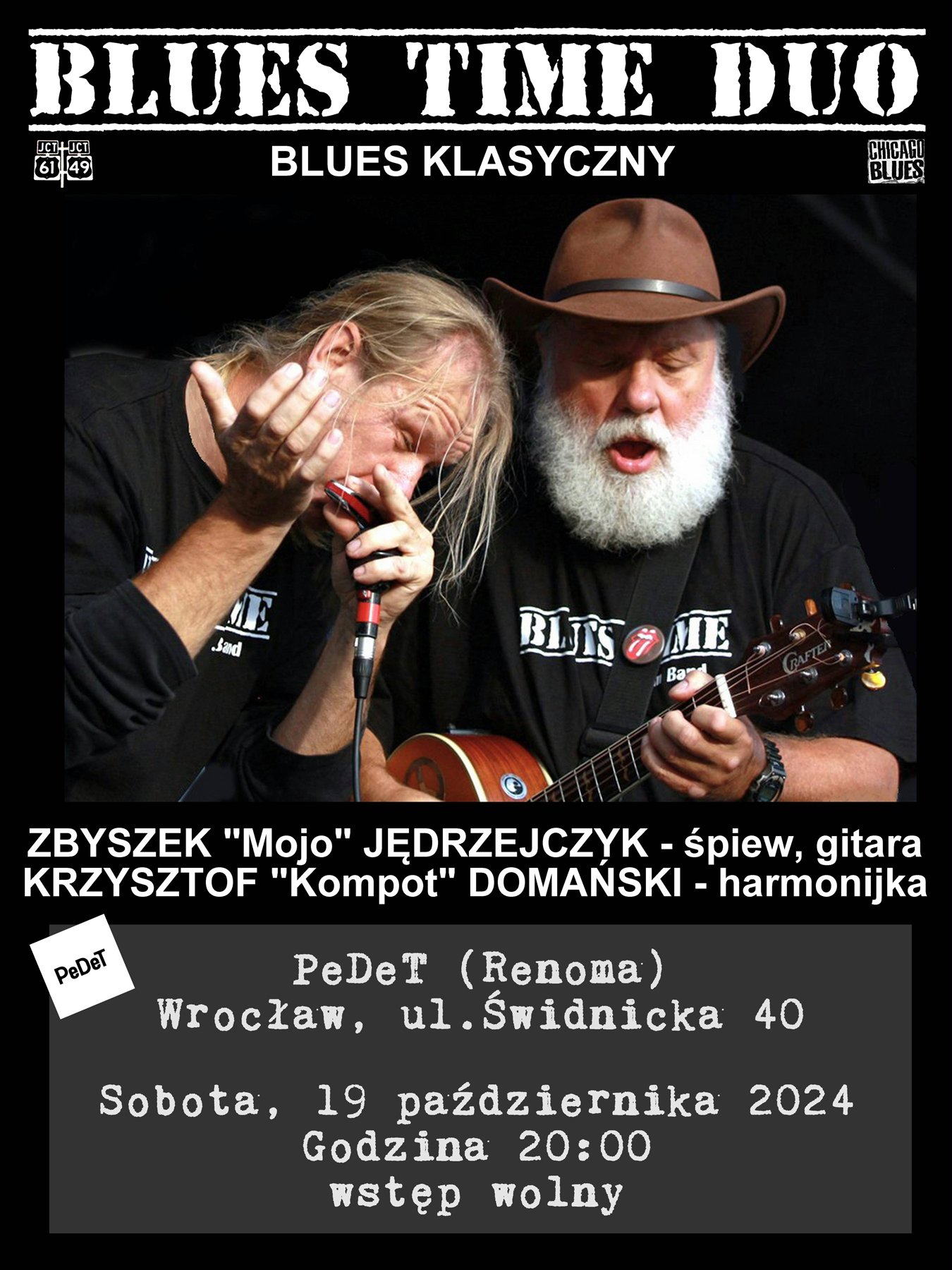 BLUES TIME DUO To frakcja istniejącej już 15 lat, warszawskiej grupy BLUES TIME. Dwóch członków tej formacji występuje czasami w formie duetu, prezentując głównie amerykańskie standardy bluesowe w klasycznej, ale z własnym sznytem, nieraz trochę spontanicznie podanej, akustycznej formie. Utwory płynące ze sceny często przeplatane są opowieściami dotyczącymi poszczególnych utworów, ich treści, czy przybliżające ich oryginalnych autorów lub wykonawców. W większości przypadków są to wielcy twórcy amerykańskiego bluesa z Delty Mississippi lub z późniejszego okresu - z Chicago. Debiut BTD wypadł w 2022 roku na „Fosa Blues Festival” w Świebodzinie i trzeba przyznać, cieszył się sporym uznaniem publiczności.