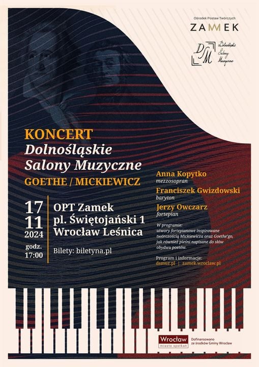 Zapraszamy na koncert poświęcony twórczości dwóch wielkich pisarzy. W programie znajdą się wirtuozowskie utwory fortepianowe inspirowane twórczością Mickiewicza (fortepianowa ballada F-dur Chopina) oraz Goethe’go (Król Elfów Liszta), jak również pieśni napisane do słów obydwu poetów (między innymi pieśń Precz z moich oczu Chopina do słów Mickiewicza). Ważnym elementem koncertu będzie ukazanie obustronnego wpływu kultury polskiej oraz niemieckiej. W tym nurcie zaprezentowane będą między innymi pieśni kompozytorów niemieckich, napisane do słów Mickiewicza (Pani Twardowska Loewe) oraz polskich do słów Goethego (Znasz-li ten kraj Moniuszki). Wystąpią: Anna Kopytko – mezzosopran Franciszek Gwizdowski – baryton Jerzy Owczarz – fortepian O Dolnośląskich Salonach Muzycznych Muzyka, którą dziś znamy jako klasyczną, w XIX wieku miała status muzyki popularnej. Ulubione arie i fragmenty z symfonii grywano w kameralnym gronie w domach prywatnych. Niektóre z utworów instrumentalnych wręcz pisano z myślą o tym, że wykonywane będą głównie przy tego typu okazjach. Intymna atmosfera koncertów salonowych sprawiała, że kontakt muzyków z publicznością był zupełnie inny, niż na występach w wielkich salach. Tę właśnie atmosferę bardzo cenił sobie Fryderyk Chopin, który dużo bardziej wolał grać właśnie na takich wydarzeniach.