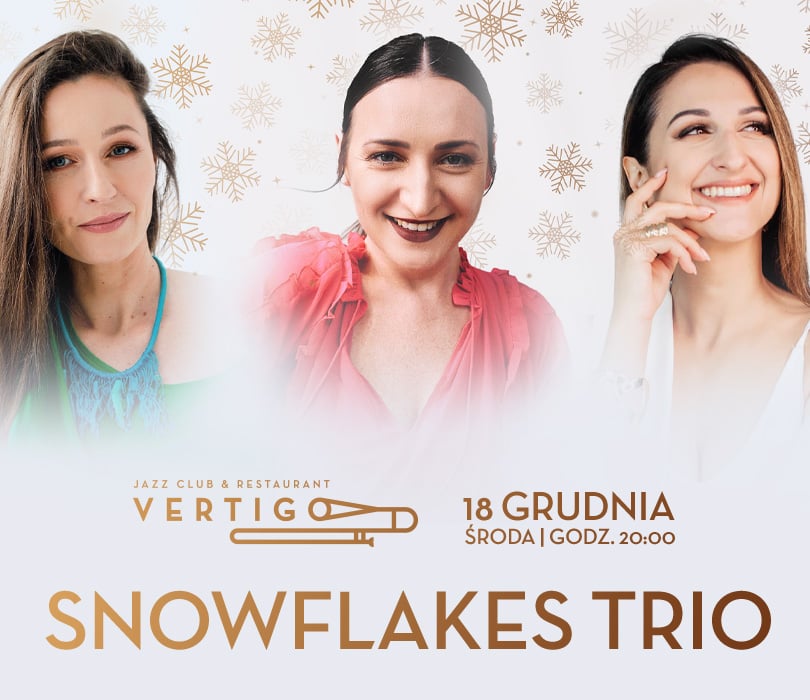 Świąteczne połączenie trzech wokalistek. Snowflakes Trio powraca! Natalia Szczypuła, Kasia Szyszka i Ola Turoń znowu razem na scenie. Zaprezentują świąteczne utwory z repertuaru: Franka Sinatry, Michael Buble, Nat King Cole, Dean’a Martina, Binga Crosby’ego i wielu innych. Towarzyszyć im będą najprzystojniejsi i najzdolniejsi wrocławscy muzycy.