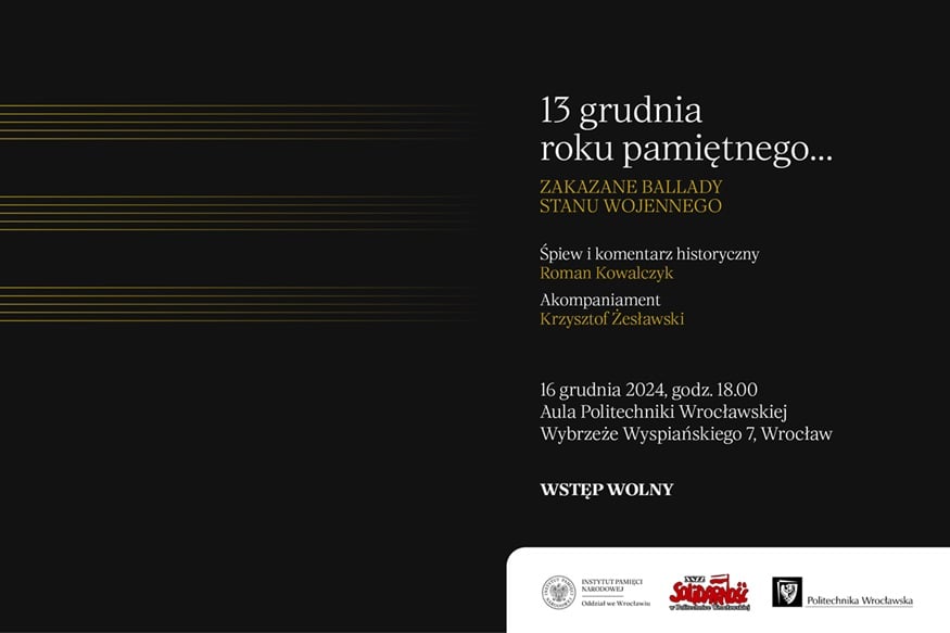 16 grudnia o godzinie 18:00 w Auli Politechniki Wrocławskiej obędzie się koncert w 43. rocznicę wprowadzenia stanu wojennego w Polsce 13 grudnia 1981 roku. W programie piosenki internowanych oraz zakazane ballady. Śpiew i komentarz historyczny Roman Kowalczyk, akompaniament Krzysztof Żesławski. Wstęp wolny!