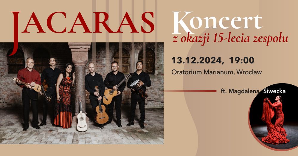 Jacaras świętuje swoje piętnastolecie! Z tej okazji zapraszamy na wyjątkowy koncert, podczas którego zespół wystąpi wraz z tancerką Magdaleną Siwecką, prezentując nowe opracowania barokowych tańców i pieśni!