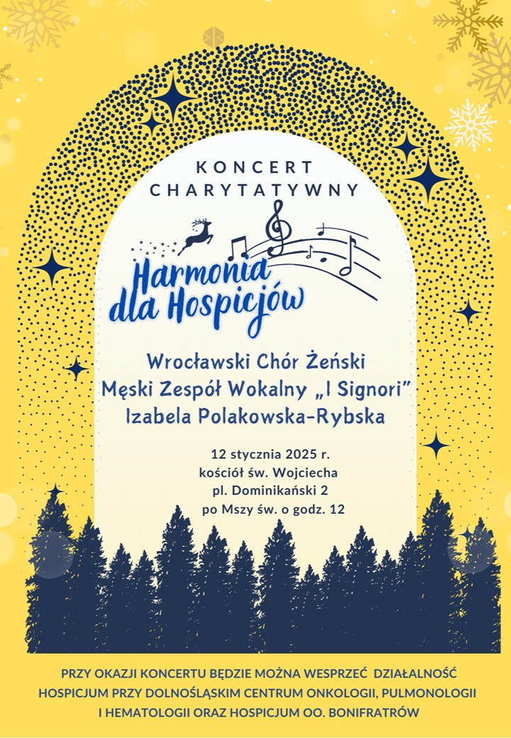 Serdecznie zapraszamy na wyjątkowy koncert charytatywny z cyklu „Harmonia dla Hospicjów”, który odbędzie się 12 stycznia 2025 r. w kościele św. Wojciecha przy pl. Dominikańskim 2 we Wrocławiu.