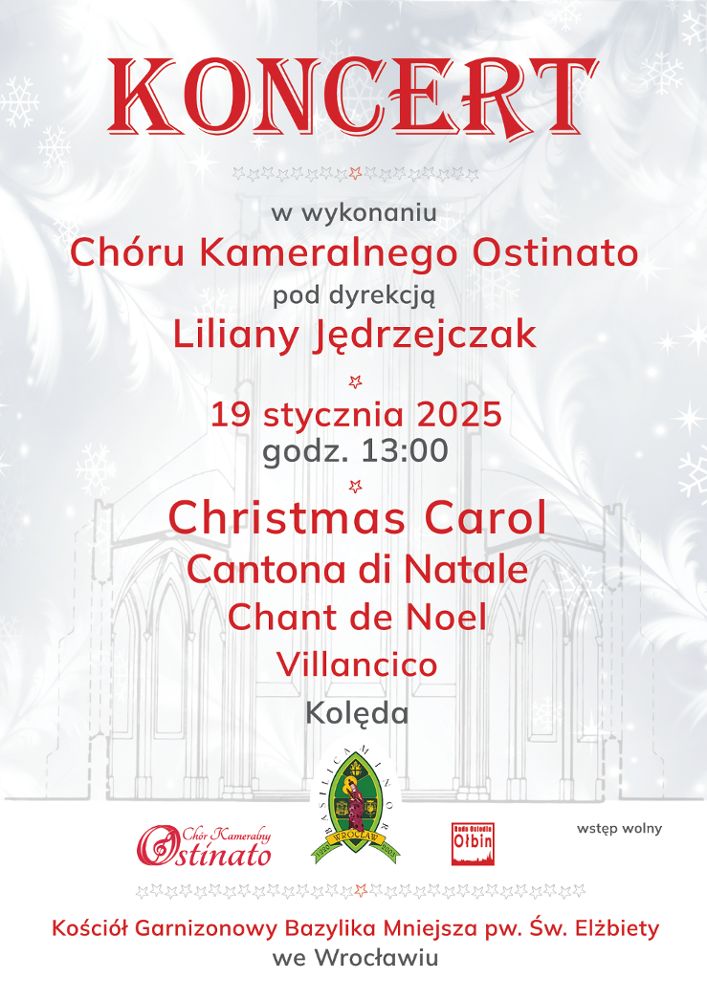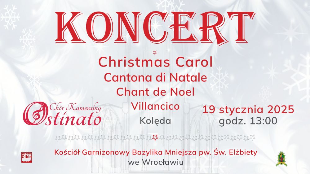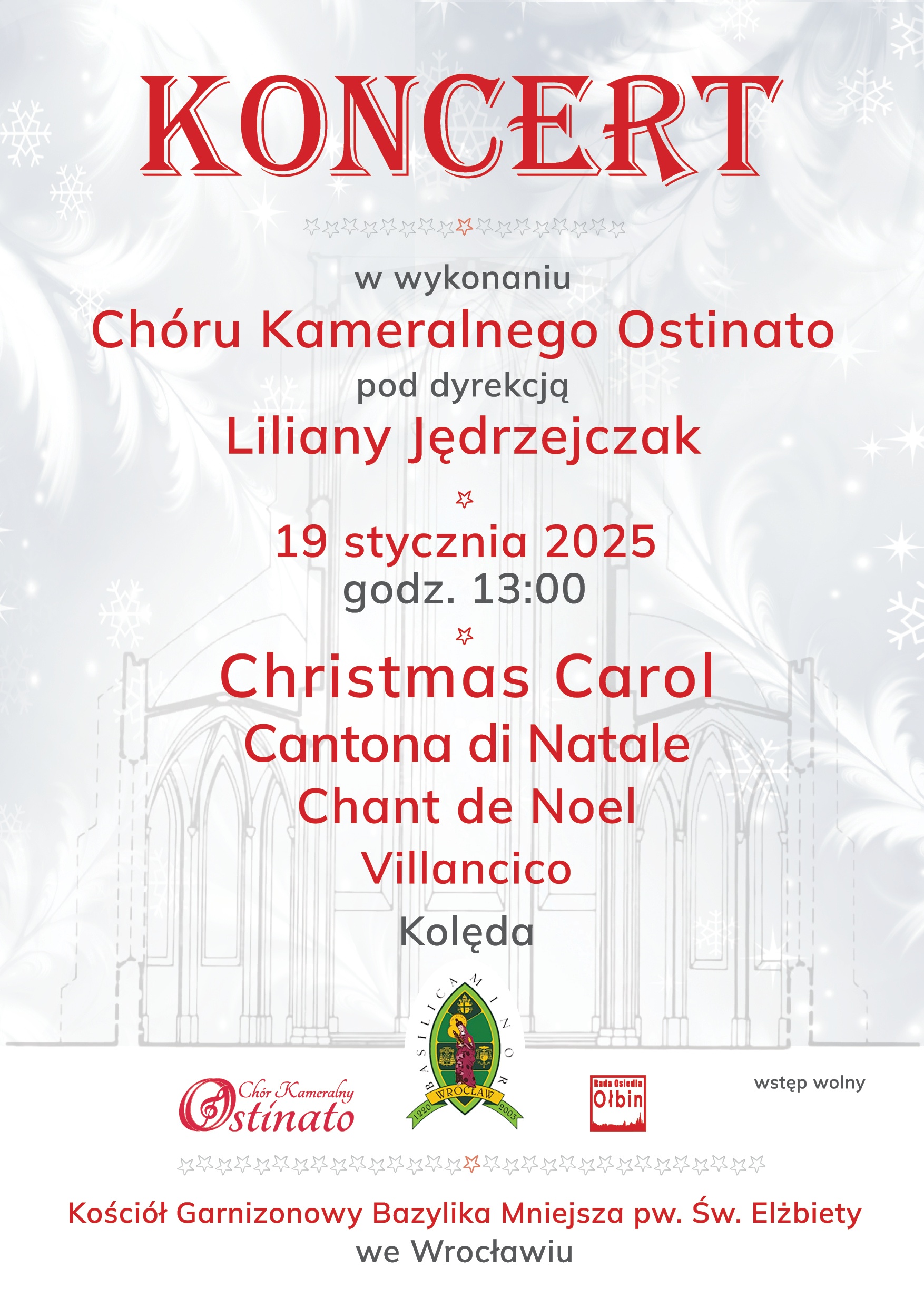 Chór Kameralny Ostinato pod dyrekcją Liliany Jędrzejczak zaprasza na koncert kolęd do majestatycznego Kościoła Garnizonowego. W programie zarówno popularne polskie kolędy, jak bożonarodzeniowe pieśni i piosenki innych narodów - w tym kilka utworów premierowych!