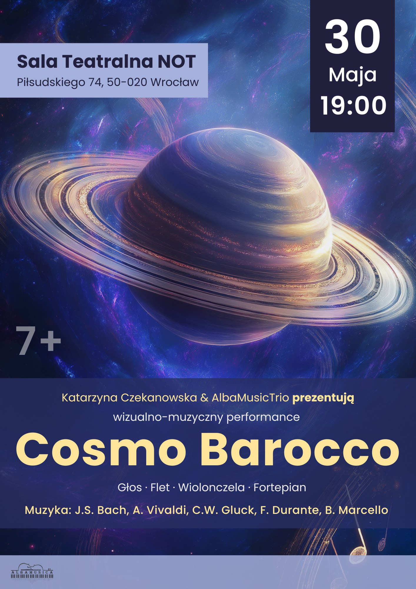 „Cosmo Barocco” to wizualno-muzyczny performance gdzie dawna elegancja spotyka nieznane galaktyki, a muzyka epoki baroku rozbrzmiewa w zupełnie nowym wymiarze. Każdy dźwięk drży na granicy emocji, budzi ciarki i wprowadza w stan uniesienia. Wsłuchaj się. Pierwsze dźwięki dotykają przestrzeni, jakby unosiły się w próżni. Flet rozcina ciszę, wiolonczela odpowiada mu głębokim rezonansem, tajemniczy głos spoza czasu – dopełni ten spektakl, a fortepian splata wszystko w hipnotyzującą całość. Delikatne światła i relaksujące wideo stworzą atmosferę, w której czas się zatrzyma, a rzeczywistość stanie się płynna.