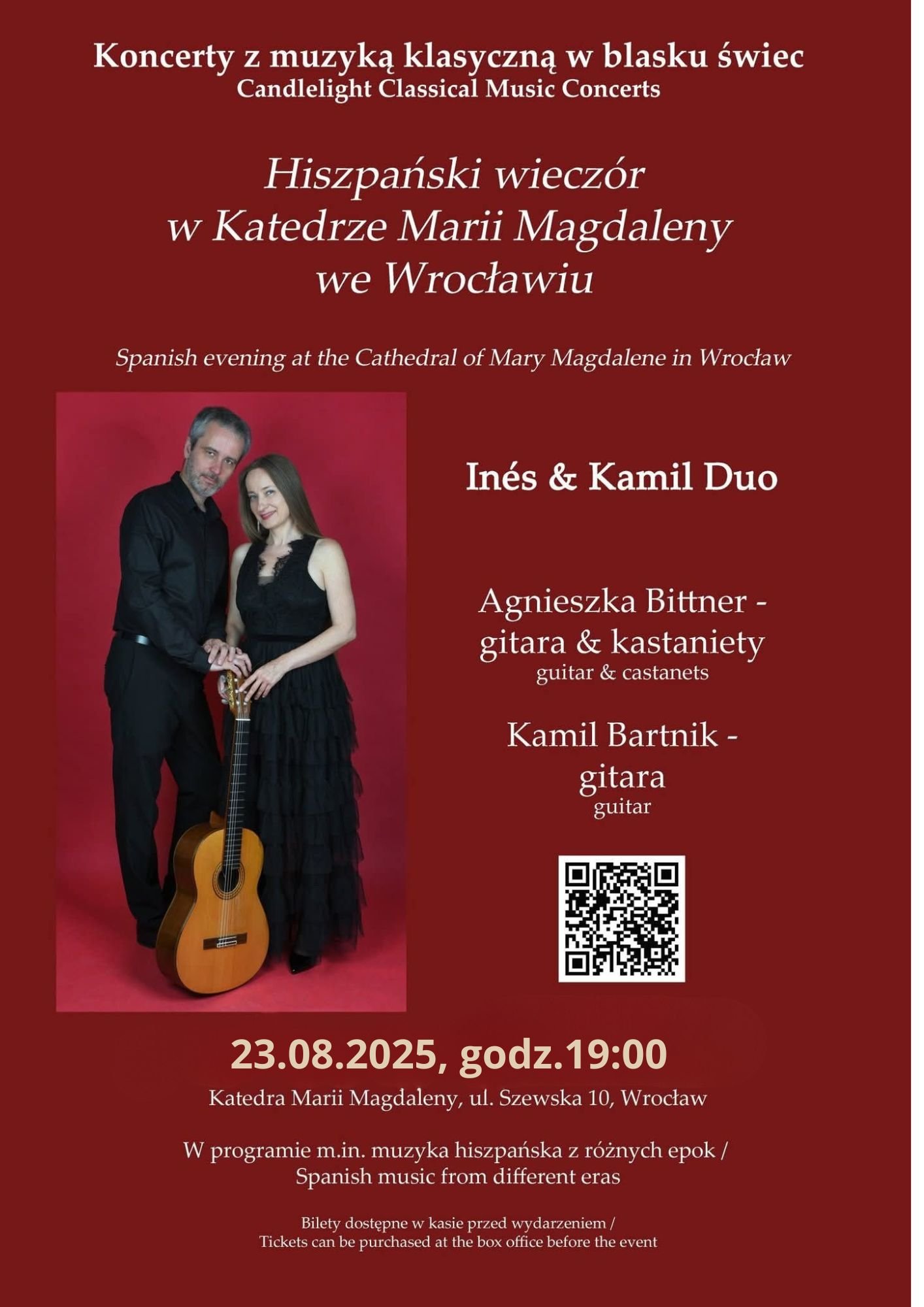 Na scenie wystąpi Ignes & Kamil Duo – duet artystów, którzy łączą wirtuozerię gitary z tańcem, kastanietami i rytmem bębna. Ich występ to coś więcej niż koncert – to spotkanie z duchem Andaluzji, opowieść opowiadana dźwiękiem, ruchem i emocją. W programie znajdą się utwory inspirowane tradycyjną muzyką flamenco, hiszpańską klasyką i tańcem ognia – wszystko to w niepowtarzalnej atmosferze gotyckiej katedry, która doda wydarzeniu wyjątkowego charakteru. To doskonała propozycja na zakończenie wakacyjnej soboty – wieczór, który przeniesie Was wprost do gorącej Hiszpanii, bez opuszczania Wrocławia.