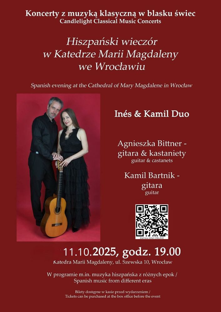 Na scenie wystąpi Ignes & Kamil Duo – duet artystów, którzy łączą wirtuozerię gitary z tańcem, kastanietami i rytmem bębna. Ich występ to coś więcej niż koncert – to spotkanie z duchem Andaluzji, opowieść opowiadana dźwiękiem, ruchem i emocją. W programie znajdą się utwory inspirowane tradycyjną muzyką flamenco, hiszpańską klasyką i tańcem ognia a także utwory własne– wszystko to w niepowtarzalnej atmosferze gotyckiej katedry, która doda wydarzeniu wyjątkowego charakteru.