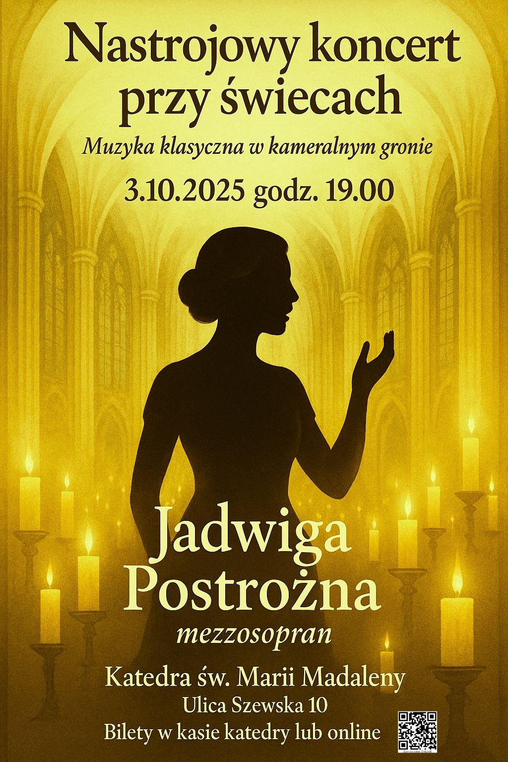 3 października 2025 roku o godz. 19:00 w Katedrze Marii Magdaleny odbędzie się wyjątkowy koncert mezzosopranistki Jadwigi Postrożnej – artystki o niezwykłej wrażliwości i sile głosu, która zachwyca publiczność na scenach operowych w Polsce i za granicą.