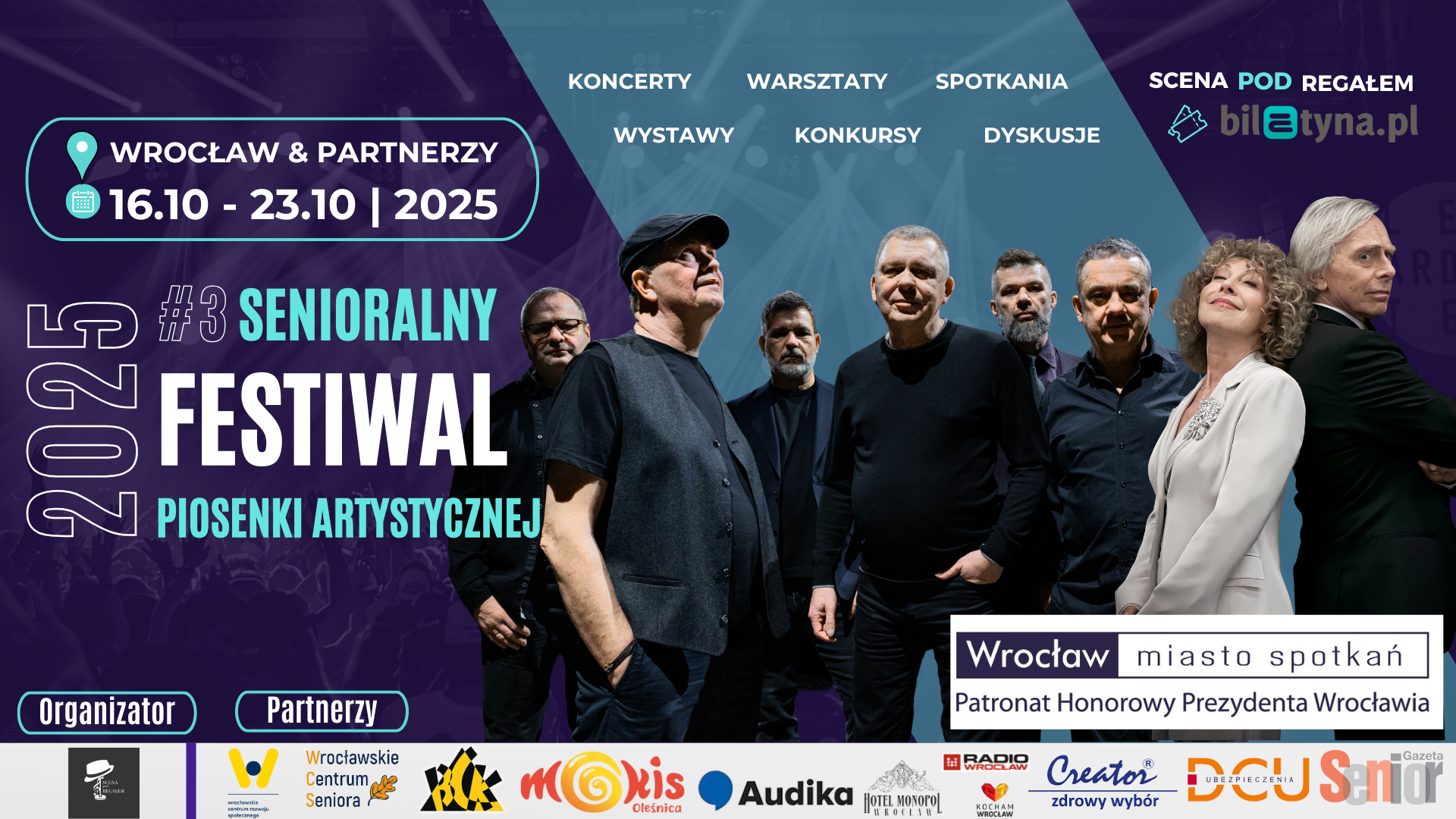 Drodzy Seniorzy, Droga Publiczności! Zapraszamy Was na nowy Festiwal Piosenki Piosenki na artystycznej mapie Polski! Kochasz śpiewać? Twoim marzeniem było zawsze wystąpić na dużej scenie? To Czas na Ciebie! Zgłoś się już teraz i zostań gwiazdą polskiej estrady! Pamiętaj! Nigdy nie jest za późno, by spełniać swoje marzenia! My te marzenia urzeczywistniamy! Już 16 dnia października rozpoczynamy 3 edycję Ogólnopolskiego Senioralnego Festiwalu Piosenki Artystycznej w ramach tegorocznych Wrocławskich Dni Seniora 2025!