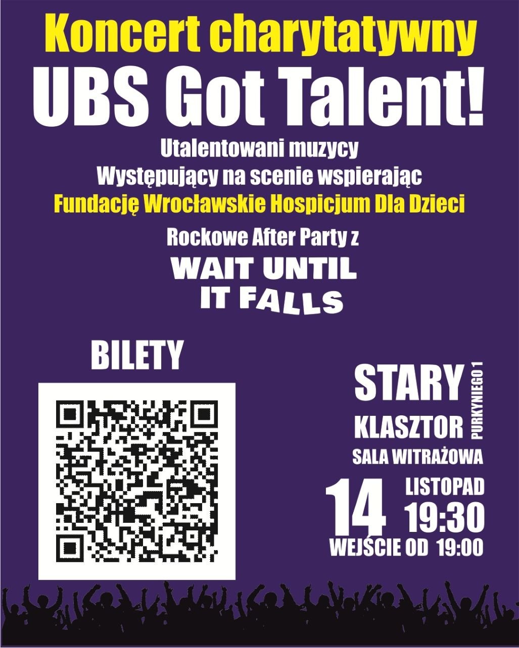 Koncert charytatywny pracowników UBS, którzy zaprezentują swoje talenty wokalne i instrumentalne. Po oficjalnej części koncert zespołu Wait Until It Falls (Pop/Rock) Całość dochodu ze sprzedaży biletów zostanie przeznaczona na wsparcie Fundacji Wrocławskie Hospicjum dla Dzieci.