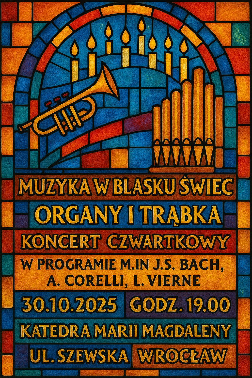 W magiczny wieczór 30 października zapraszamy Was do wnętrza rozświetlonego blaskiem świec, gdzie zabrzmią organy i trąbka w wyjątkowym dialogu dźwięków. W programie utwory mistrzów: J.S. Bacha, A. Corellego, L. Vierne’a – muzyka pełna światła, głębi i wzruszeń.