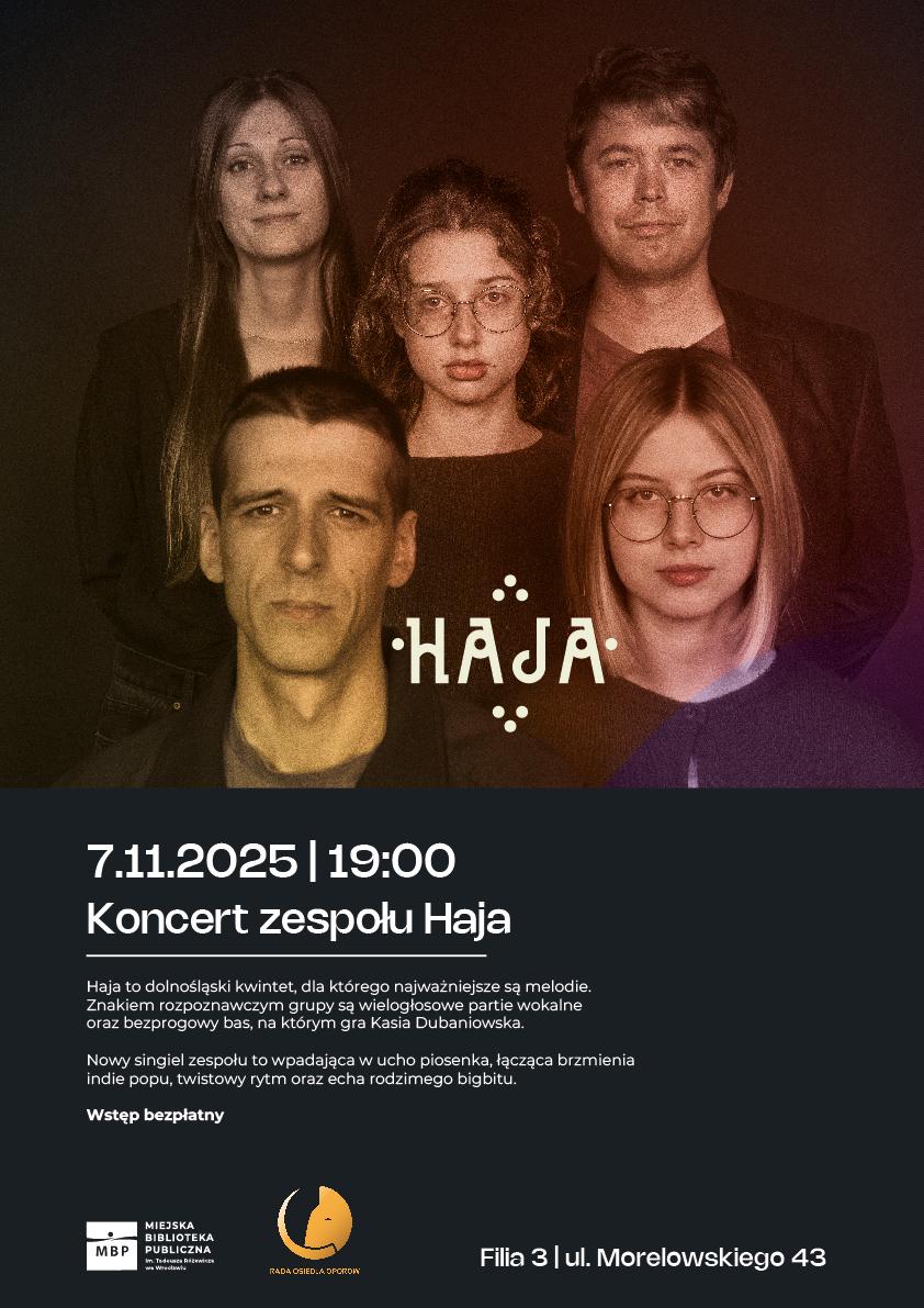 Rada Osiedla Oporów i Filia 3 Miejskiej Biblioteki Publicznej im. Tadeusza Różewicza we Wrocławiu, zapraszają na koncert zespołu Haja, który odbędzie się w dniu 7 listopada 2025 o godz. 19:00 w bibliotece przy ul. Morelowskiego 43.