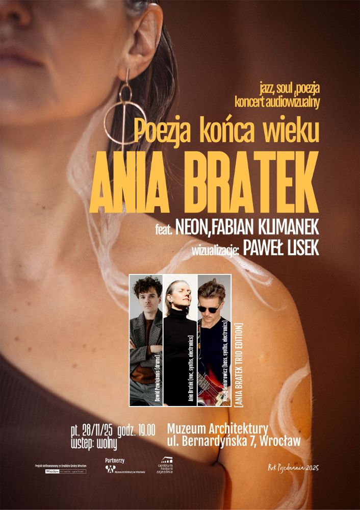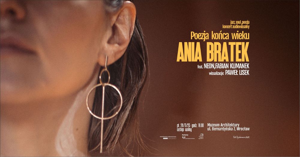 To koncert łączący muzykę, słowo i obraz – poetycką refleksję o relacjach międzyludzkich, pamięci i współczesnym świecie. Zabytkowe wnętrze Muzeum Architektury stanie się przestrzenią wyjątkowego spotkania dźwięku, światła i emocji. Ani Bratek towarzyszyć będą wrocławscy i katowiccy artyści sceny jazzowej i elektronicznej: Maciej Seniorowicz, Dawid Pawlukanis, Bartek „Neon” Podsiadły, Fabian Klimanek, a za wizualizacje odpowiada prof. Paweł Lisek (ASP Wrocław).