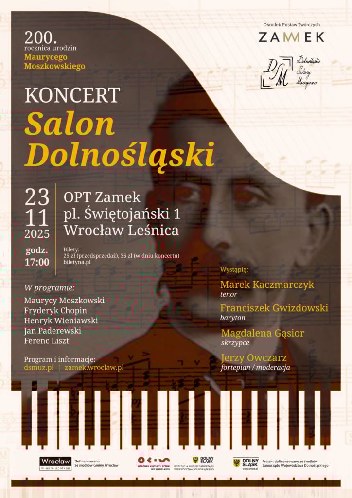 W 2025 roku przypada 200 rocznica urodzin Maurycego Moszkowskiego – wybitnego kompozytora, pianisty i pedagoga pochodzącego z Wrocławia, przedstawiciela europejskiego romantyzmu. Z tej okazji zapraszamy na koncert poświęcony jego twórczości, a także muzyce artystów, których występy na Dolnym Śląsku pozostawiły trwały ślad w historii regionu. W programie znajdą się fortepianowe kompozycje Fryderyka Chopina, który koncertował w Dusznikach-Zdroju, skrzypcowe dzieła Henryka Wieniawskiego, a także utwory Ignacego Jana Paderewskiego i Ferenca Liszta, którzy występowali m.in. we Wrocławiu. Wieczór będzie muzyczną podróżą przez romantyzm – pełen wirtuozerii, emocji i wspomnień o artystach, którzy swoimi koncertami wzbogacili kulturalne dziedzictwo Dolnego Śląska.