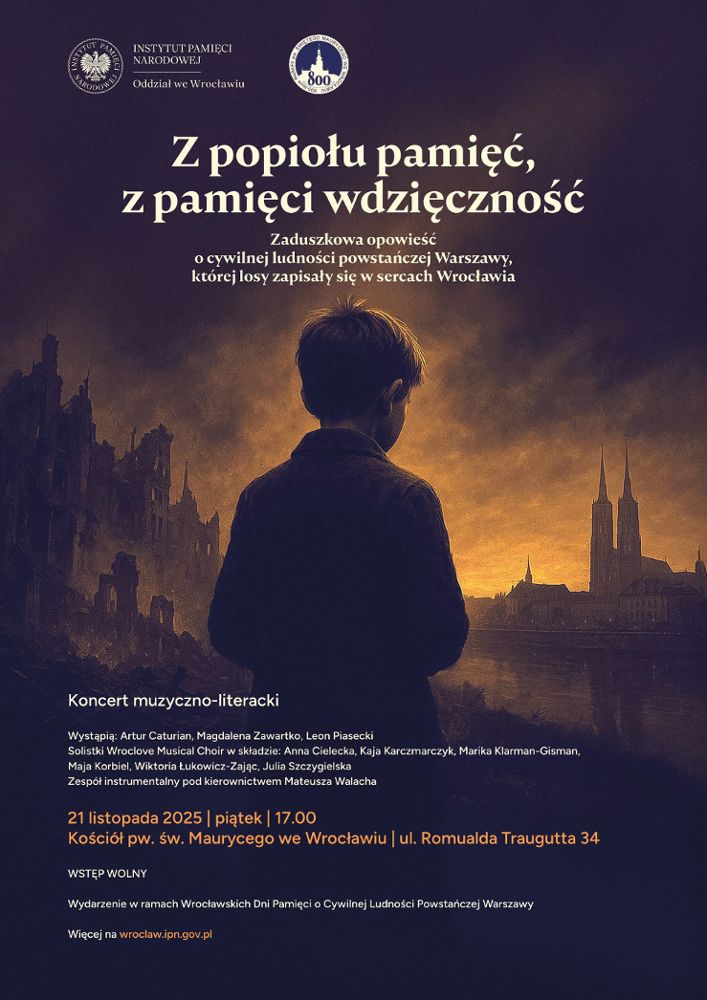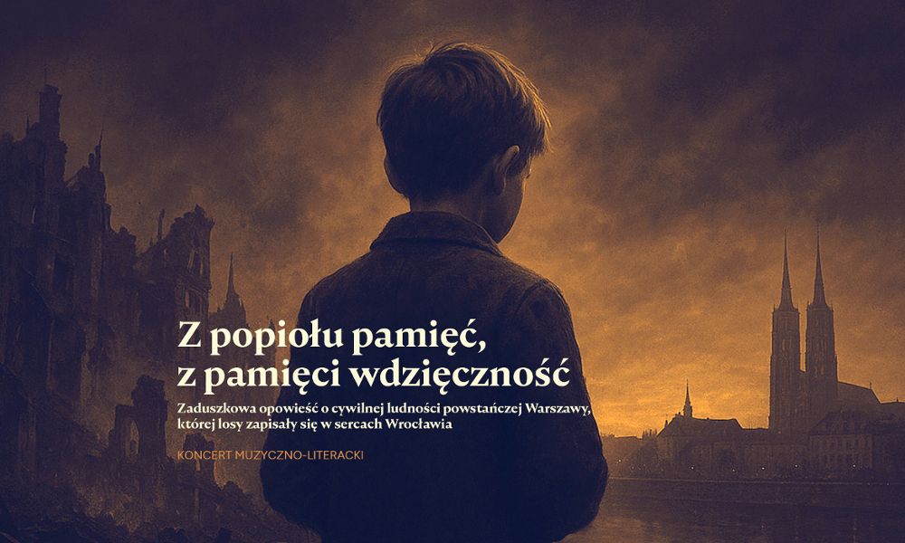 W czasie wydarzenia muzyka, słowo i światło połączą się w jedną zaduszkową narrację o losach cywilów powstańczej Warszawy – o rodzinach wyrwanych ze swojego miasta, o dzieciach zmuszonych do dorastania w ruinach, o ocalonych niosących ze sobą pamięć jako jedyny trwały ślad utraconego świata. Wspominamy tych, których życie przerwała wojna, oraz tych, którzy przeżyli i przekazali świadectwo dalej, także tutaj, na Dolnym Śląsku. Wrocław, miasto odbudowane rękami ludzi przybyłych z różnych stron, nosi w swojej tożsamości również historię warszawskich rodzin wypędzonych ze stolicy.