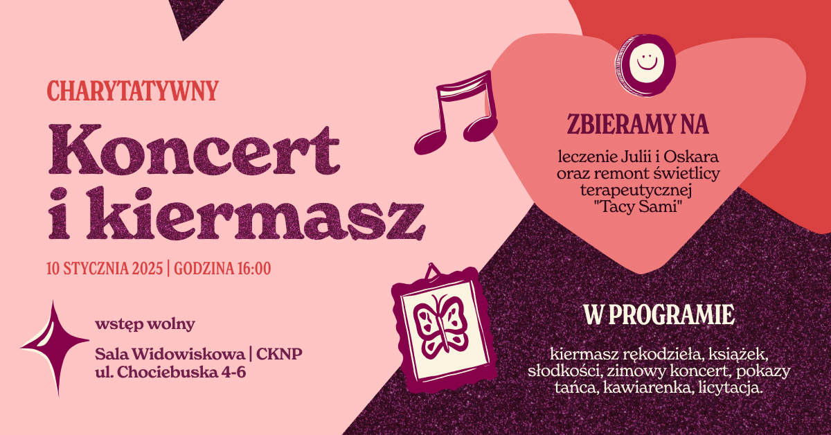Zapraszamy na poruszające wydarzenie charytatywne, które powstało z potrzeby serca i ogromnej siły lokalnej społeczności. Podczas koncertu, kiermaszu i licytacji zbieramy środki na leczenie Julii i Oskara oraz remont świetlicy terapeutycznej „Tacy Sami” – miejsca, które od ponad 30 lat wspiera osoby z niepełnosprawnościami na Nowym Dworze.
