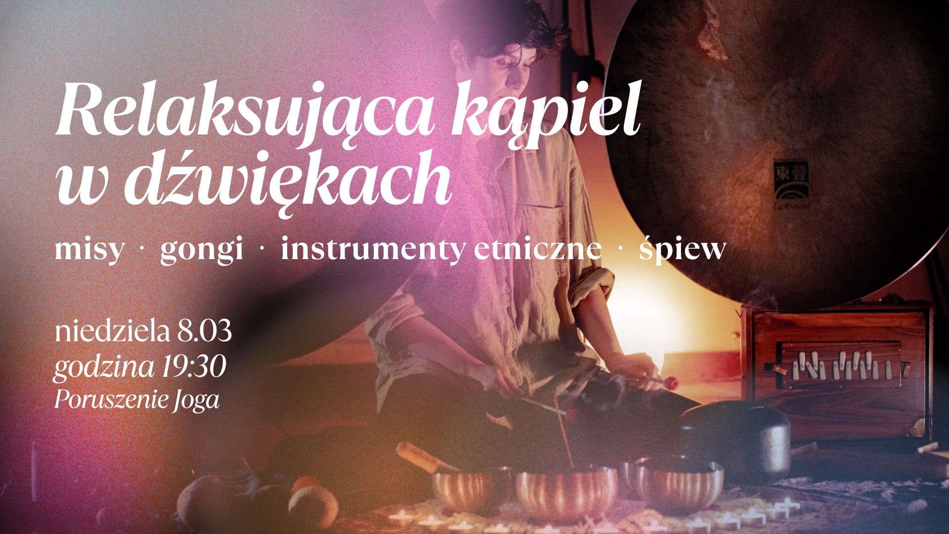 Zapraszamy na sesję dźwiękową trwającą 60 minut z prowadzoną medytacją, podczas której możesz doświadczyć, jak wibracje gongu i mis oddziałują na ciało i wspierają uwalnianie napięć. Połączenie masażu dźwiękiem z ciepłym brzmieniem instrumentów etnicznych umożliwia osiągnięcie głębokiego relaksu.