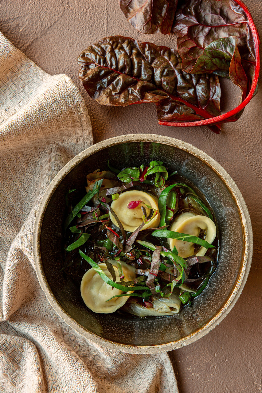 Rosół z gęsi grillowana kapusta/ boćwina/ pierożki z gęsiną