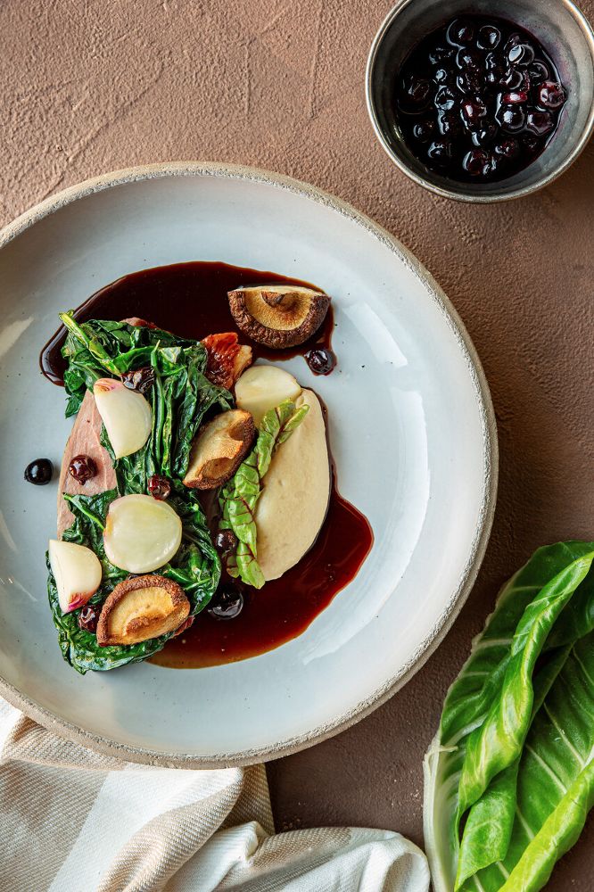 Pierś z gęsi rzepa/ jarmuż/ grzyby shiitake/ czarna porzeczka
