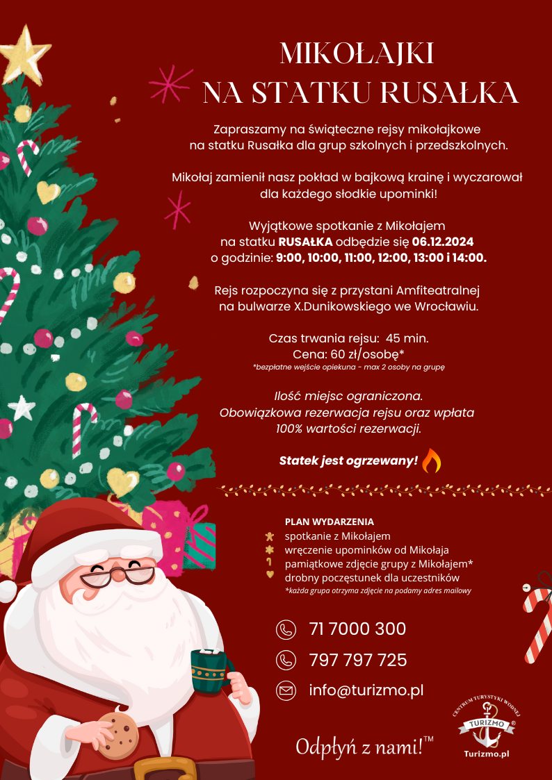 W dniu 6.12 (piątek) zapraszamy na świąteczne, mikołajkowe rejsy statkiem Rusałka dla szkół i przedszkoli. Nasz największy statek - Rusałkę odwiedzi Święty Mikołaj! Jednostka jest ogrzewana, a na pokładzie znajduje się bar oraz toalety. Jak co roku w grudniu statek jest pięknie przystrojony świątecznymi ozdobami. Mikołaj zamienił nasz pokład w bajkową krainę i wyczarował dla każdego słodkie upominki!