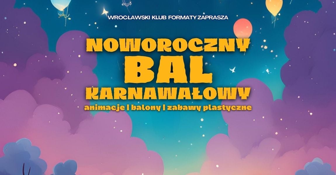 Serdecznie zapraszamy na noworoczny bal karnawałowy dla dzieci! Zaproszone są wszystkie dzieci wraz z opiekunami. Animatorzy zabawy przeniosą uczestników do krainy śmiechu, tańców i frajdy, gdzie podczas dwóch godzin poprowadzą liczne gry, zabawy integracyjne oraz konkursy, w tym konkurs na króla i królową balu.
