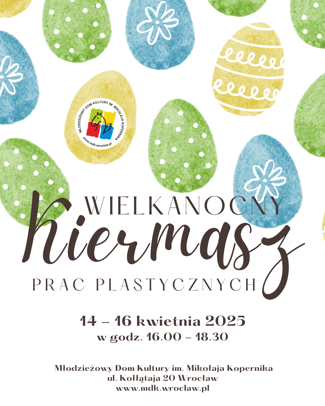 W dniach 14-16 kwietnia 2025, w godz. 16:00-18:30 Młodzieżowy Dom Kultury im. Mikołaja Kopernika zaprasza na wielkanocny kiermasz, na którym będzie można nabyć prace plastyczne powstałe w pracowniach MDKu.