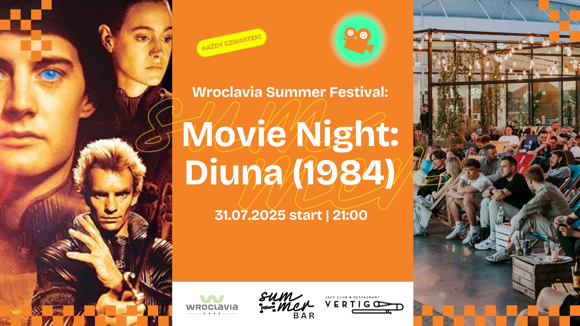Tym razem na ekranie kultowa „Diuna” w reżyserii Davida Lyncha – ekranizacja legendarnej powieści Franka Herberta. To prawdziwa uczta dla fanów science fiction, pełna niesamowitych wizji, kosmicznych intryg i niepowtarzalnego klimatu lat 80. Zobaczycie Paula Atrydę w walce o przetrwanie na pustynnej planecie Arrakis – planecie, gdzie rodzi się legenda. Czekamy na Was na dachu Wroclavii – z wygodnymi leżakami, pysznymi koktajlami, aromatyczną pizzą i ogromnym telebimem.