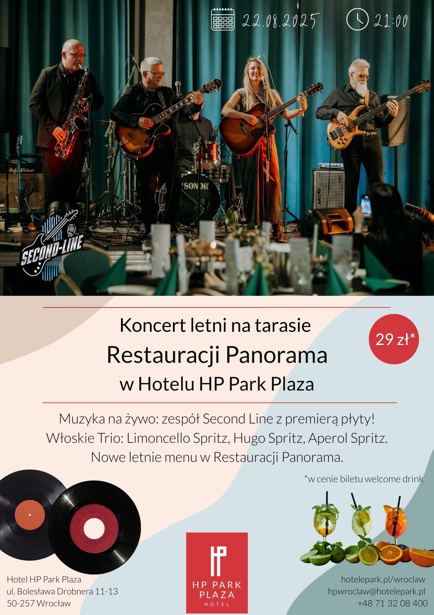 Zanurz się w letnim klimacie na wyjątkowym koncercie plenerowym w samym sercu Wrocławia! Na tarasie z malowniczym widokiem na Odrę wystąpi zespół Second Line, prezentując po raz pierwszy utwory ze swojej nowej płyty, a także dobrze znane i lubiane covery.