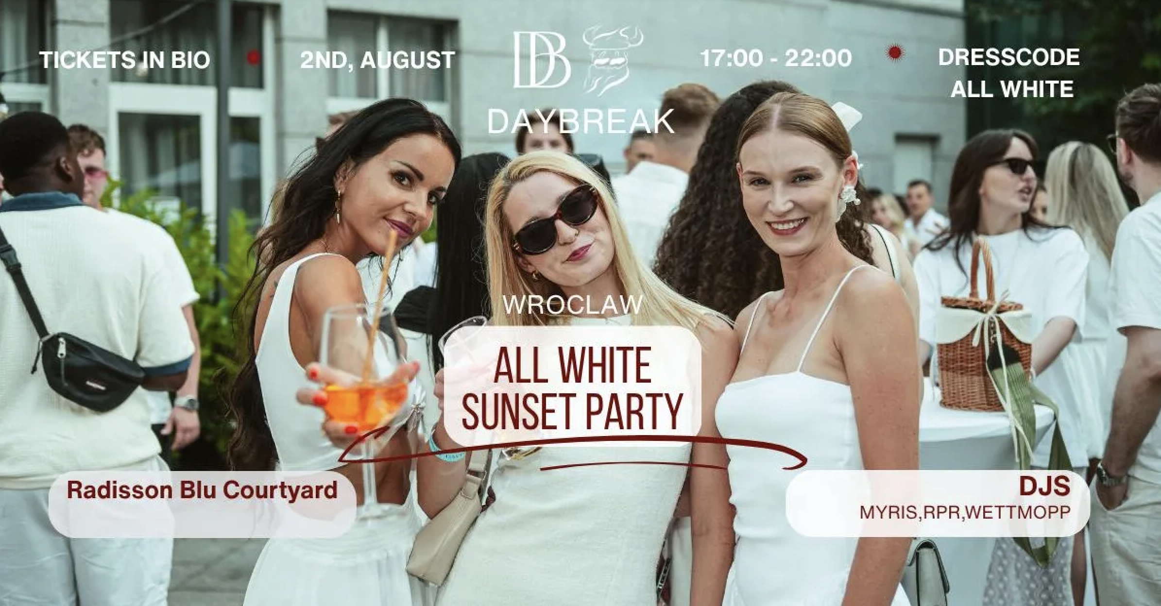 All White Sunset Party powraca! Ta sama energia, nowy klimat. Dołącz do nas na Vol. 2 — wyjątkowe, plenerowe wydarzenie o zachodzie słońca w zielonym dziedzińcu Radisson Blu.