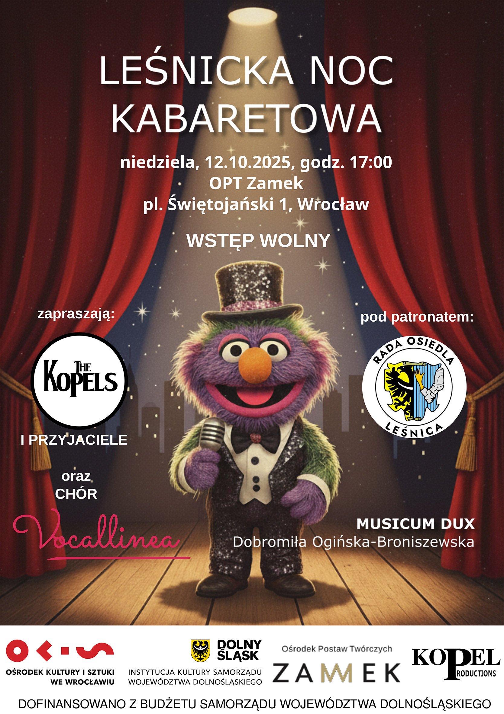 Grupa The Kopels i Przyjaciele od lat z pasją tworzy różnorodne projekty muzyczne, sięgając po rocka, country, szanty czy formy kabaretowe. W czasie pandemii zrodził się pomysł koncertów poświęconych piosence kabaretowej – pierwszy z nich odbył się online, a kolejne spotkania na żywo spotkały się z życzliwym przyjęciem publiczności w różnych miejscach. Tym razem artyści zawitają do Zamku w Leśnicy, aby zaprezentować publiczności prawdziwe perełki gatunku.