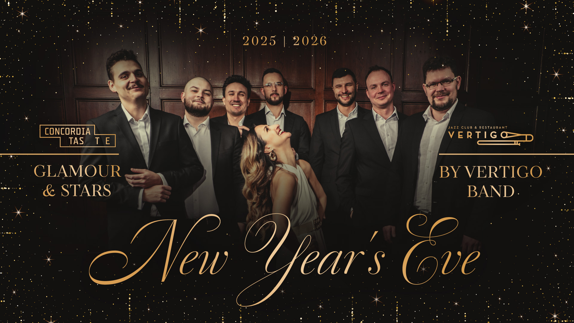 tak jak obiecywaliśmy, w tym roku Vertigo Jazz Club & Restaurant łączy siły z Concordia Taste, aby wspólnie stworzyć wyjątkowe wydarzenie na pożegnanie 2025 roku. Z ogromną radością zapowiadamy sylwestrową noc pełną elegancji, blasku i filmowej magii, która odbędzie się w przestrzeniach budynku Concordii.