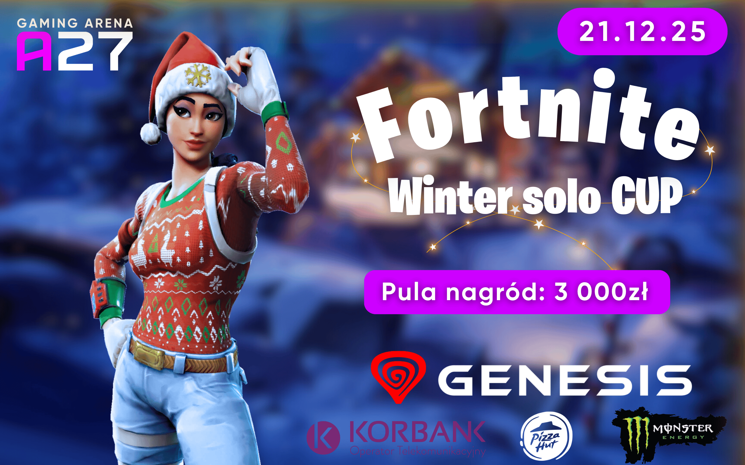 Zapraszamy wszystkich fanów Fortnite na wyjątkowy LAN-owy turniej solo, który odbędzie się 21 grudnia 2025 w samym sercu Wrocławia – Arena27, Rynek 49 (II piętro). To idealna okazja, aby sprawdzić swoje umiejętności, poczuć esportowe emocje i powalczyć o atrakcyjne nagrody!