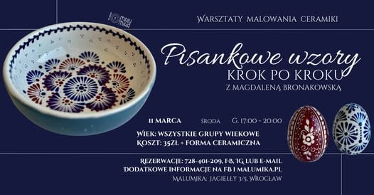 Zapraszamy na warsztaty malowania ceramiki krok po kroku inspirowane pisankowymi wzorami! Pod okiem lokalnej artystki, uczestnicy ozdobią ceramiczne jaja, kubki, talerze lub miski charakterystycznymi ornamentami – roślinnymi zawijasami, geometrycznymi wzorami, symbolami wiosny czy subtelnymi kropkowaniami nawiązującymi do ludowych technik zdobienia jajek metodą batikową, ale nie tylko.