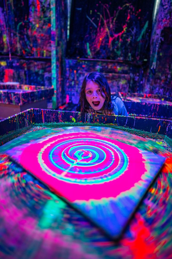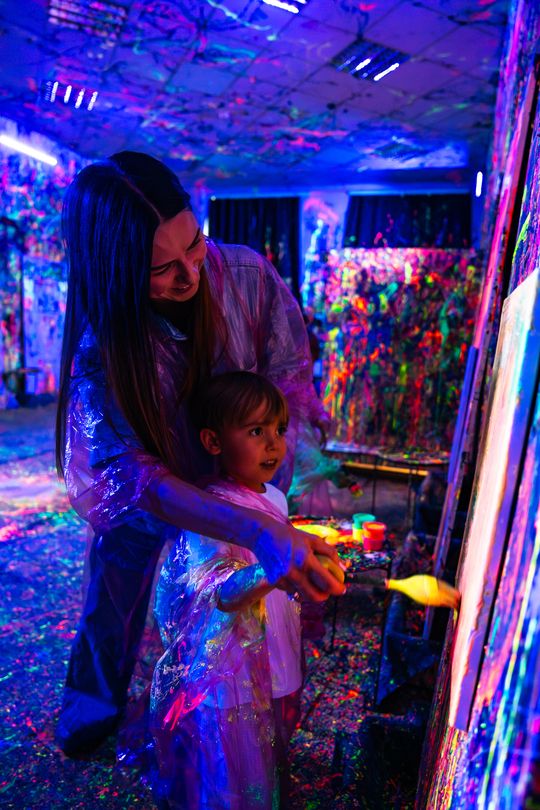 Oferujemy różnorodne sesje malarskie w technice action painting. Jedną z najpopularniejszych atrakcji jest malowanie w ciemności – podczas wyjątkowych sesji FLUO odkryjesz magię tworzenia przy użyciu neonowych farb.