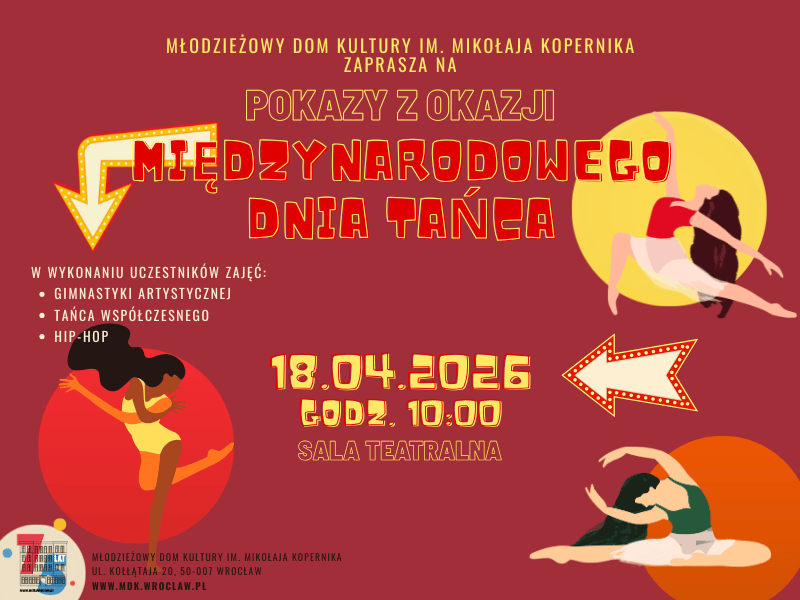 Tańcem można wyrazić to, czego nie da się opisać słowami. Z okazji nadchodzącego Międzynarodowego Dnia Tańca, Młodzieżowy Dom Kultury im. Mikołaja Kopernika zaprasza na pokazy grup tanecznych z pracowni:
