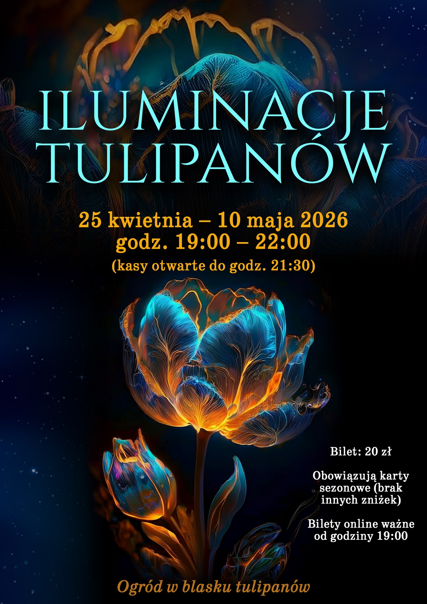 I w tym roku mamy przyjemność zaprosić Państwa na "Iluminacje Tulipanowe". Inaczej prezentują się rośliny o poranku, inaczej za dnia, a jeszcze inaczej wieczorami....dlatego pragniemy pokazać Państwu kwitnące rośliny w delikatnym świetle, jako dodatkową formę odwiedzenia Ogrodu. Jeżeli chcemy wciąż Państwa zachwycać, musimy wymyślać nowe, ciekawe formy zwiedzania . I to jedna z nich. W zeszłym roku bardzo się Państwu spodobała, mamy nadzieję że i w tym roku będziecie chętnie nas odwiedzać.
