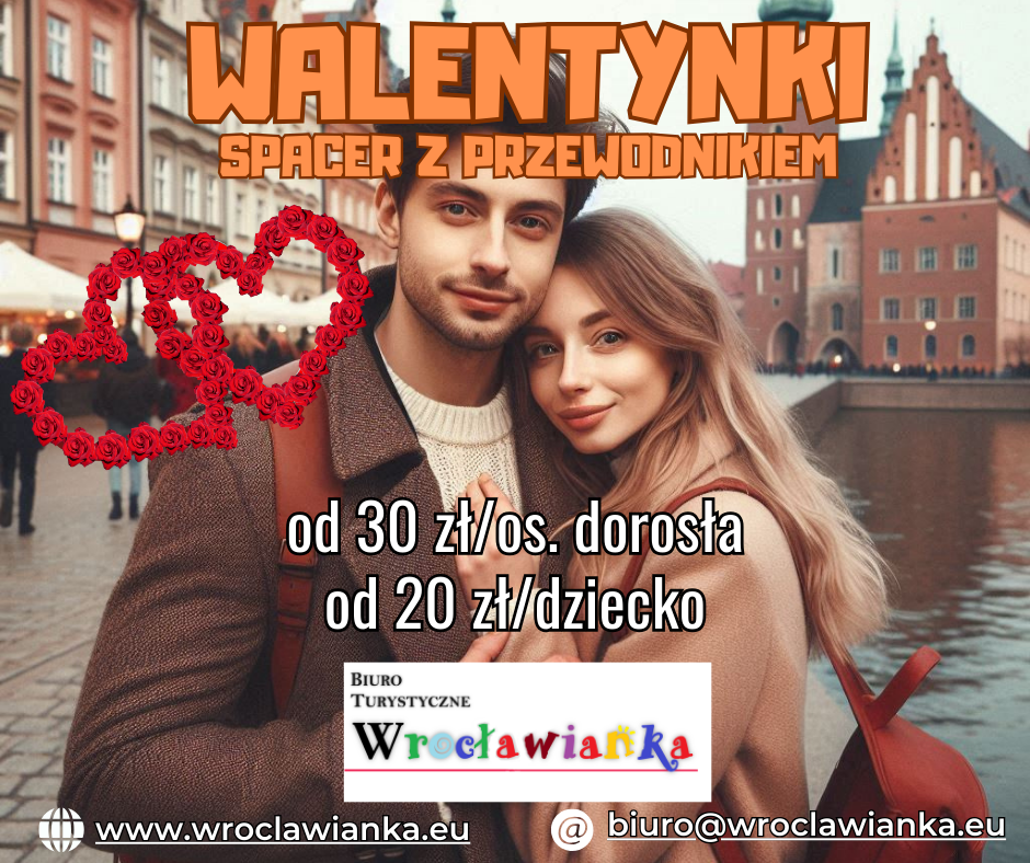 Zapraszamy zakochane pary oraz osoby poszukujące miłości na wieczorny spacer. Podczas około półtoragodzinnej wędrówki wrocławski przewodnik opowie fascynujące i zaskakujące historie miłosne – zarówno z okresu średniowiecza, jak i współczesności. Odkryjemy miejsca, gdzie rozegrały się niezwykłe romanse, a także przeprowadzimy quiz sprawdzający, czy uczestniczące pary są dla siebie stworzone. Dla singli przewodnik przygotował cenne wskazówki, jak odnaleźć swoją drugą połówkę.