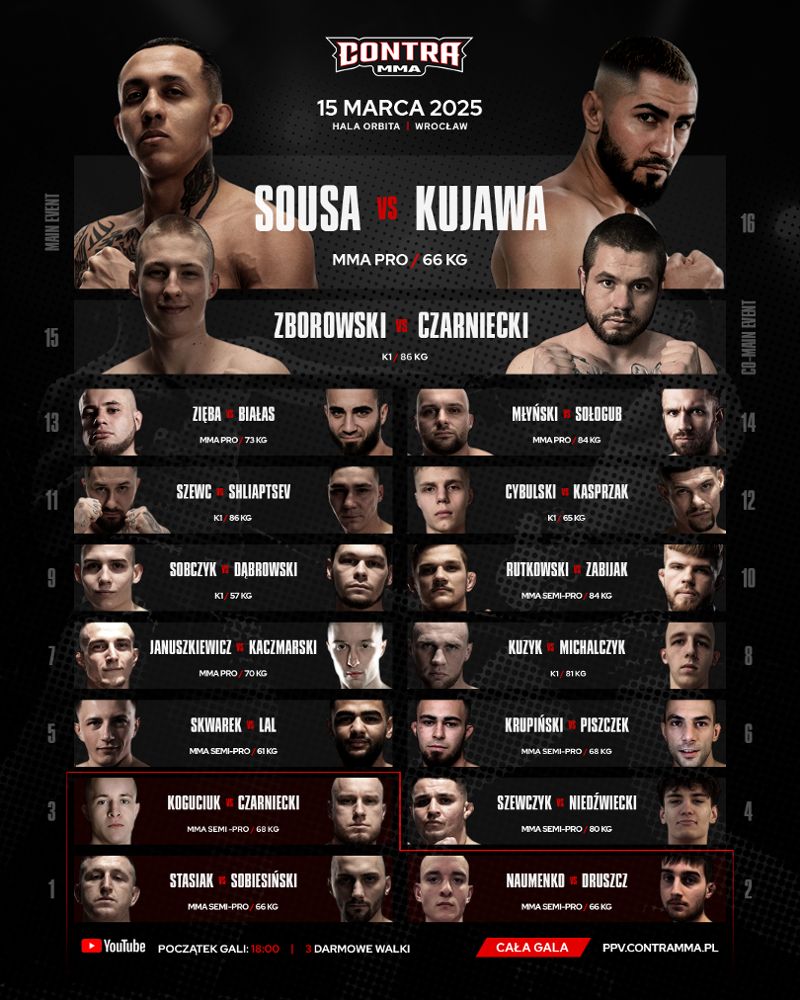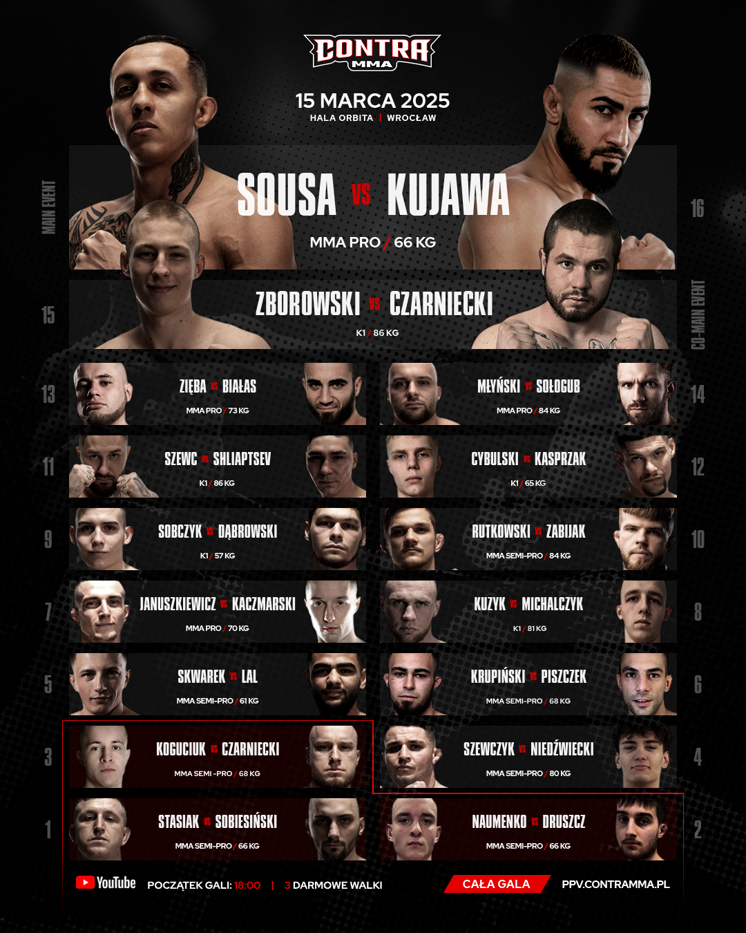 Kibice zobaczą Jonatana Kujawę i Acrisio Sousę. Zawodnicy zmierzą się w formule MMA w kategorii do 66 kg. Kujawa (3-2-0) to reprezentant wrocławskich klubów Bonzai MMA i Berserkers Team Wrocław; wszechstronny fighter, posiadacz czarnego pasa w karate i purpurowego w BJJ.