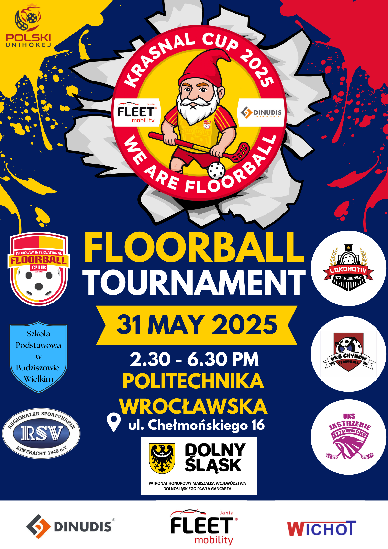 Zapraszamy na pierwszą edycję Krasnal Cup 2025, jest to międzynarodowy turniej unihokeja dla dzieci do 14 lat. Turniej jest organizowany pod patronatem Marszałka Województwa Dolnośląskiego pana Pawła Gancarza.
